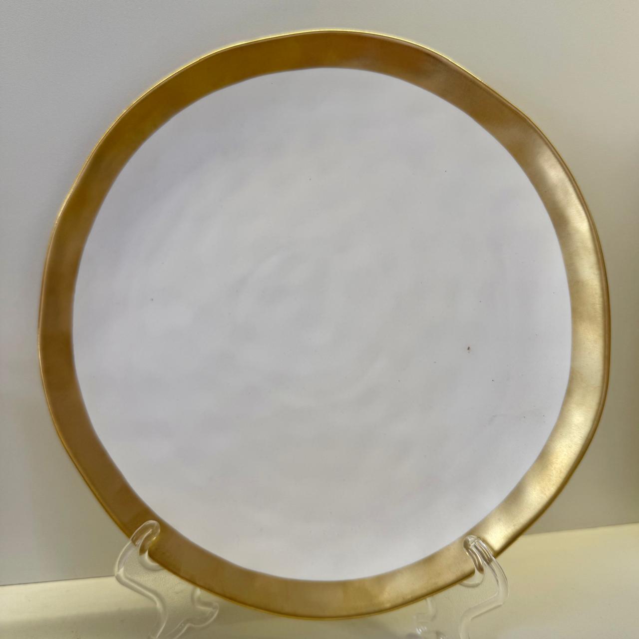 Fabricado com porcelana de alta qualidade, o prato possui um acabamento branco brilhante, que adiciona um toque de requinte a qualquer ocasião. O detalhe dourado delicado e elegante ao redor da borda do prato acrescenta um toque de glamour sutil, tornando-o ideal para ocasiões especiais e jantares refinados.