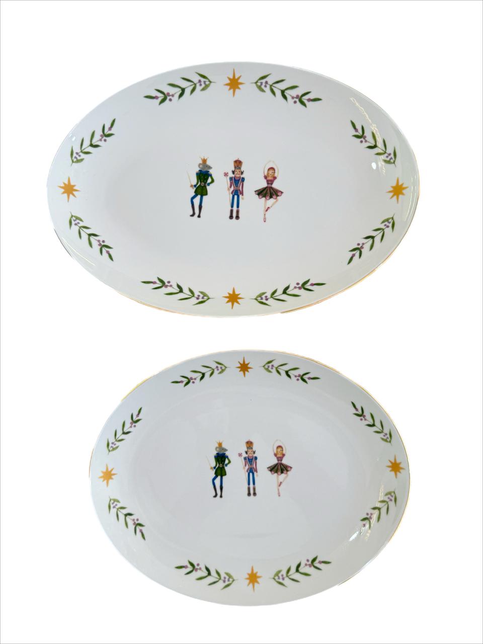 Travessa branca com filete dourado em toda borda e aplicação de decalque.