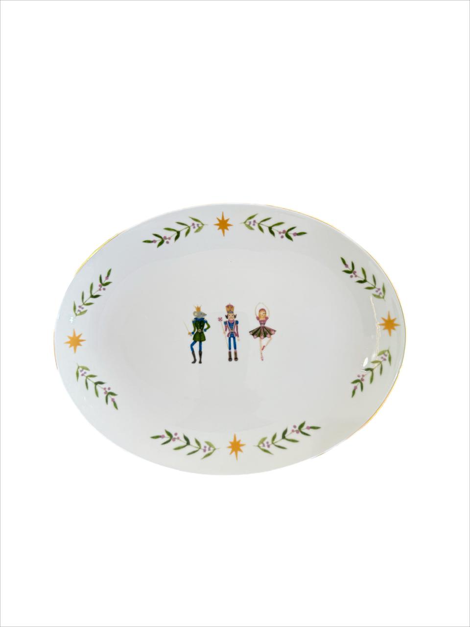 Travessa branca com filete em ouro em toda borda e aplicação de decalque em desenhos com tema natalino.
