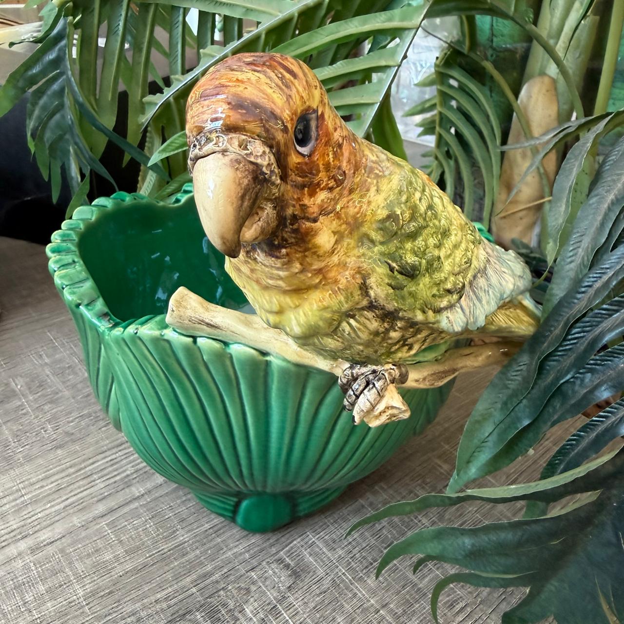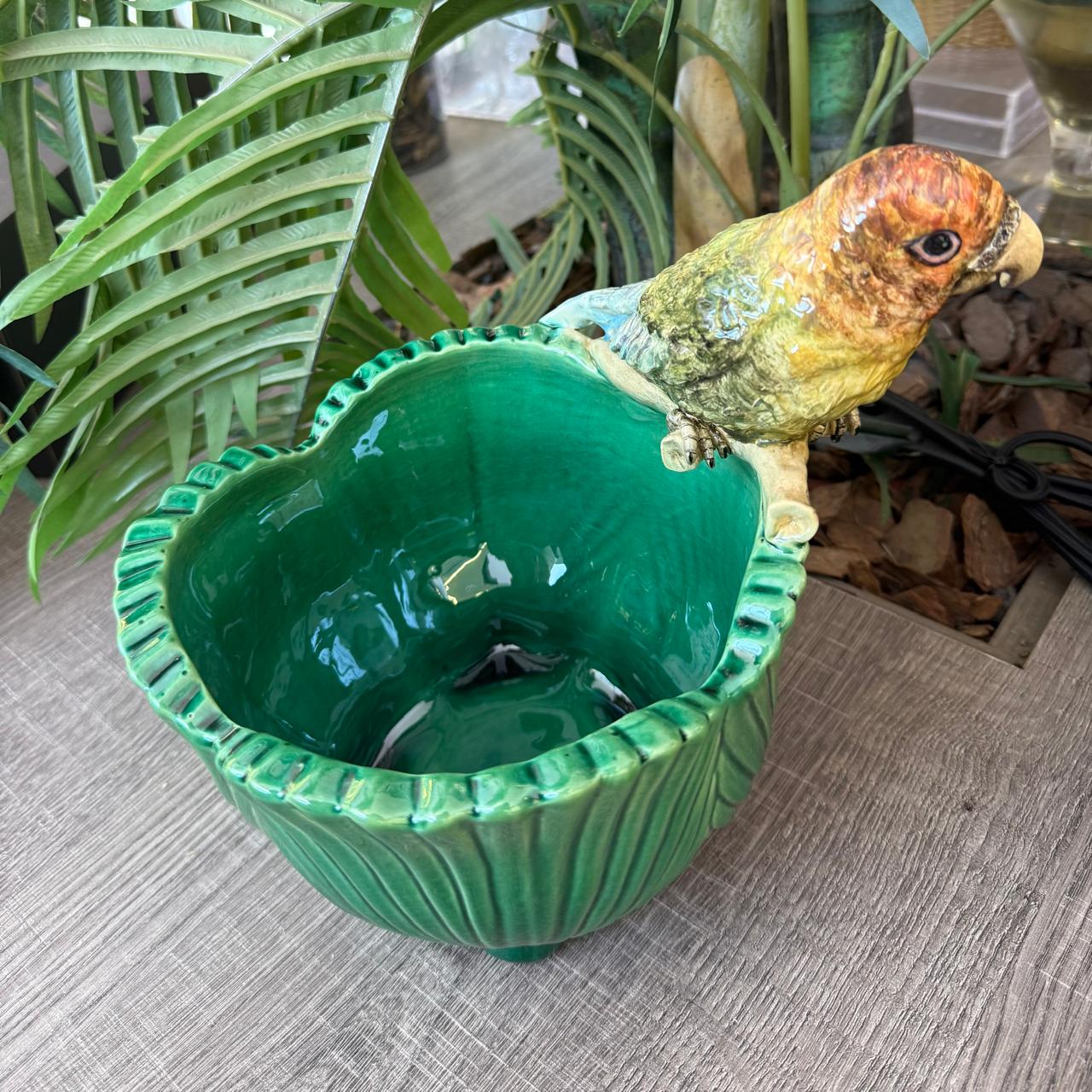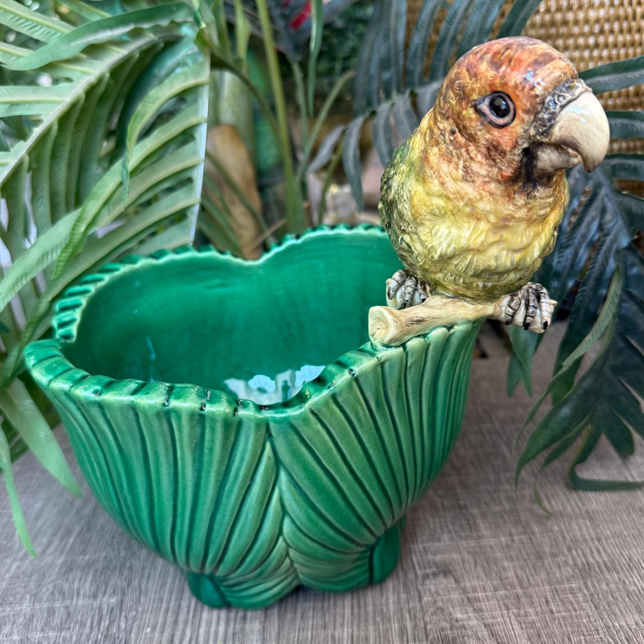 A combinação do verde suave com a ararinha no tronco cria um visual encantador, perfeito para compor mesas, aparadores ou cantinhos especiais da casa. Mais do que um objeto decorativo, é uma peça que carrega história, cuidado e a beleza do trabalho manual.