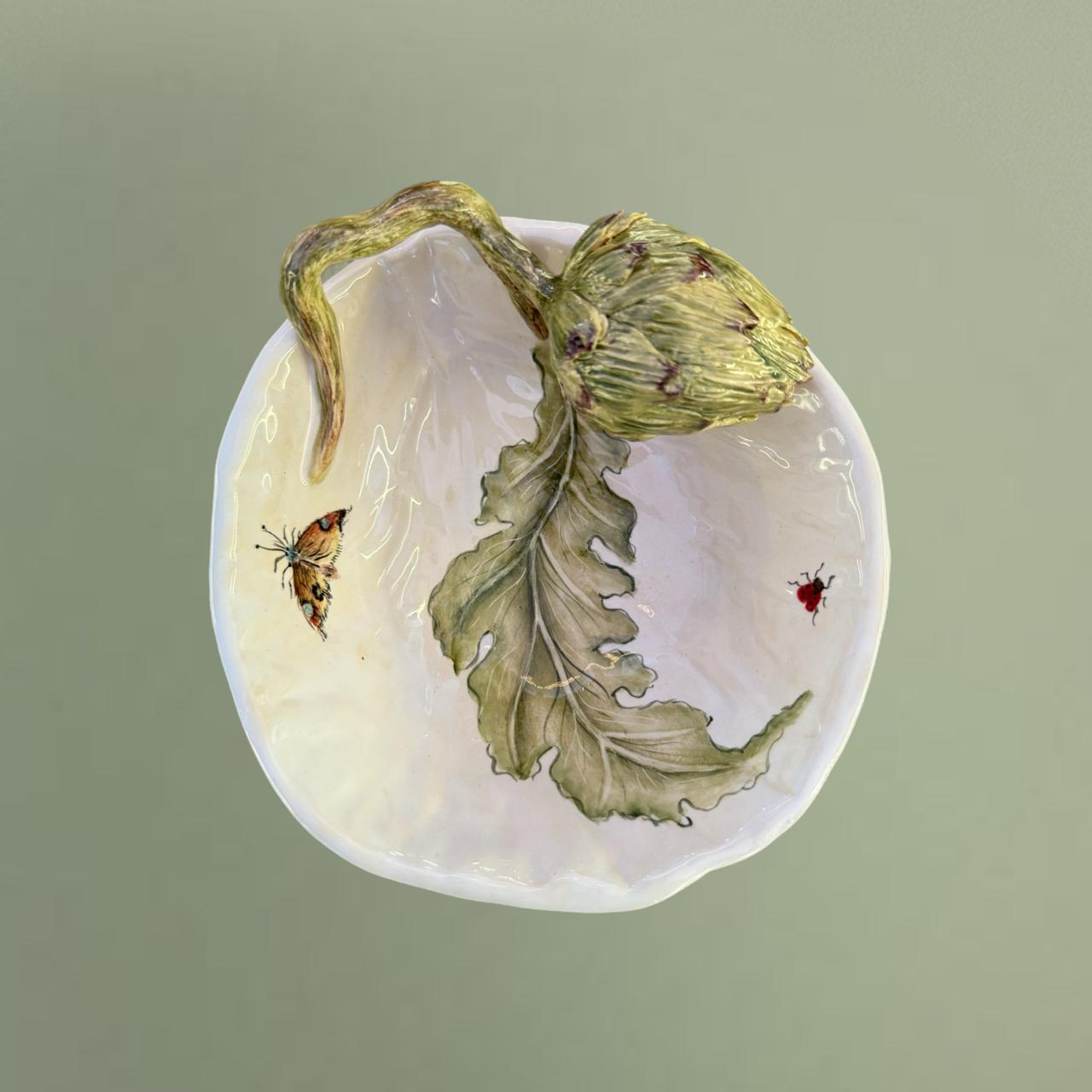 Esse lindo e delicado bowl em formato de folha de repolho com aplique de alcachofra, é uma peça que vai fazer a diferença na hora de servir.Um produto que reproduz com muita realidade a apliçcação.