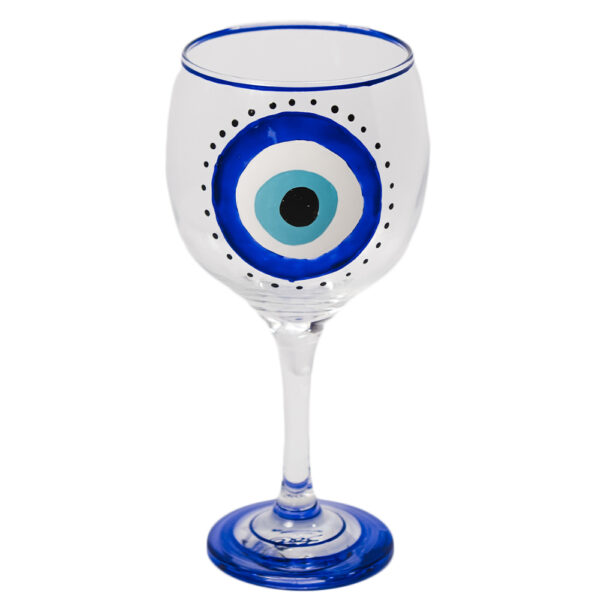 Taça para servir gin ou a bebida de sua preferência, em vidro, com pintura feita à mão com motivo “Olho Grego”