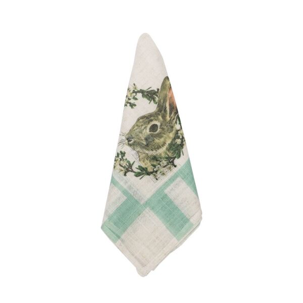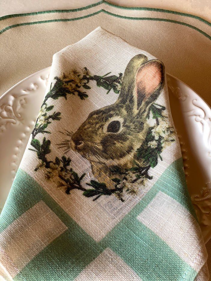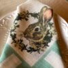 Guardanapo em Linho bege e verde menta com desenho de coelho, para colorir e alegra a sua mesa.