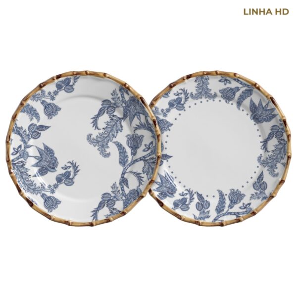 O PRATO RASO CERÂMICA FLOWERS PRINT AZUL é um prato redondo de cor branca estampado com desenhos na cor azul, com bordas em relevo na cor marrom claro, representando o bamboo. É o prato de jantar perfeito para servir a refeição principal, compor a decoração da mesa posta e fazer de momentos como confraternizações em família e amigos ainda mais especiais!