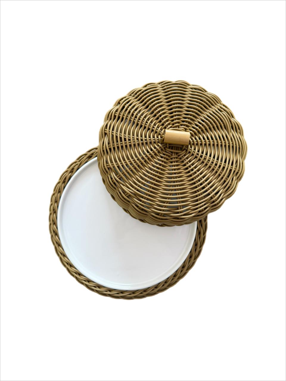Prato redondo Cerâmica com vime de Diâmetro de 30cm com cobre bolo g com Puxador de bambu.