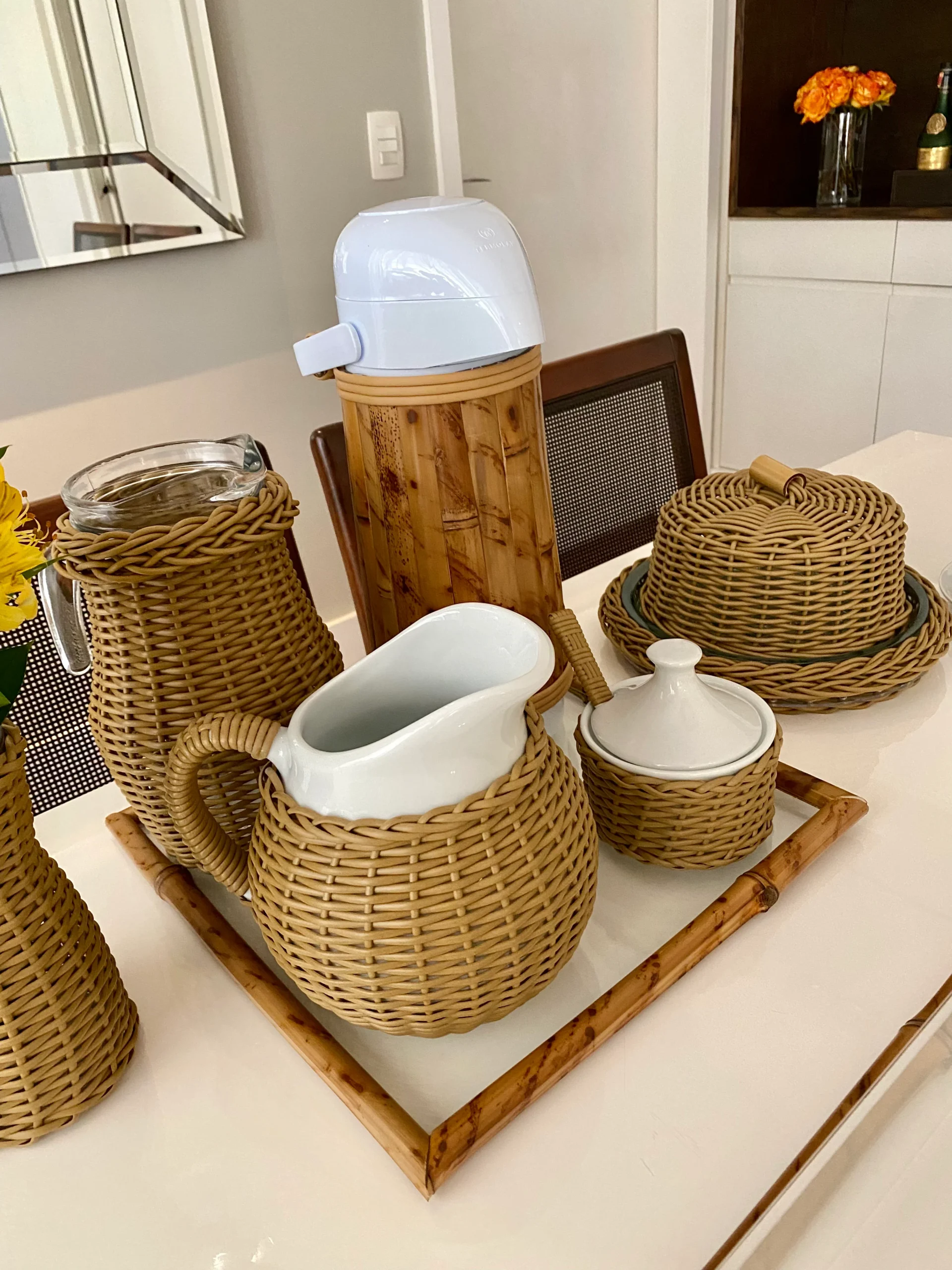 Jarra cerâmica branca com acabamento de fibra sintética como vime na cor ocre