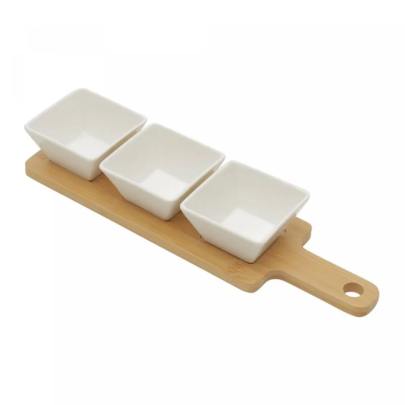 Sirva seus petiscos com elegância e estilo com o Conjunto 3 Petisqueiras com Bandeja de Bambu Branco da Wolff.
