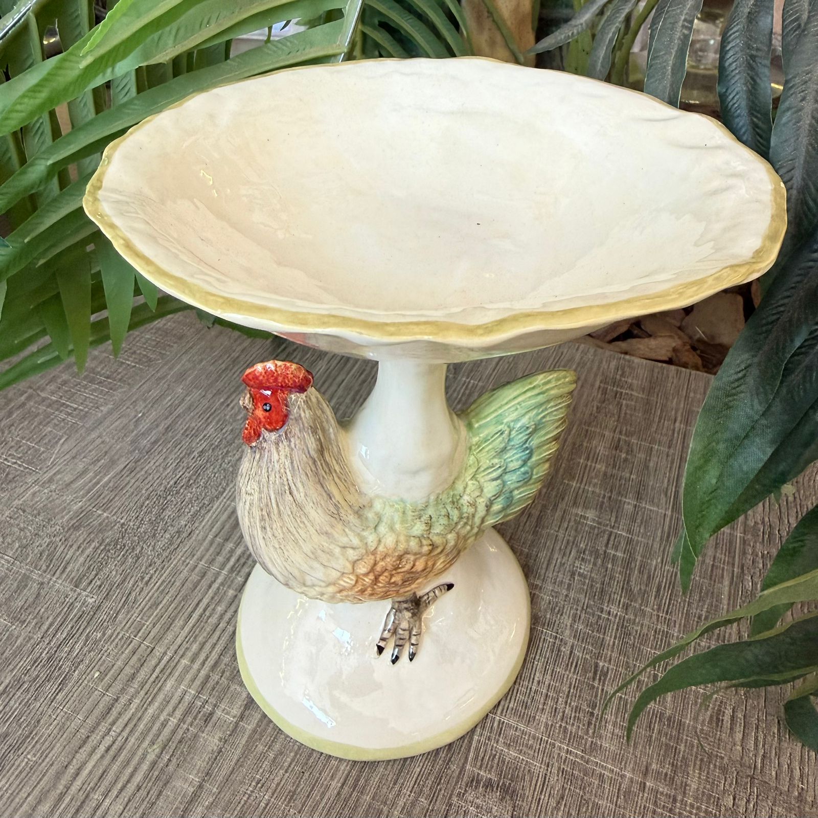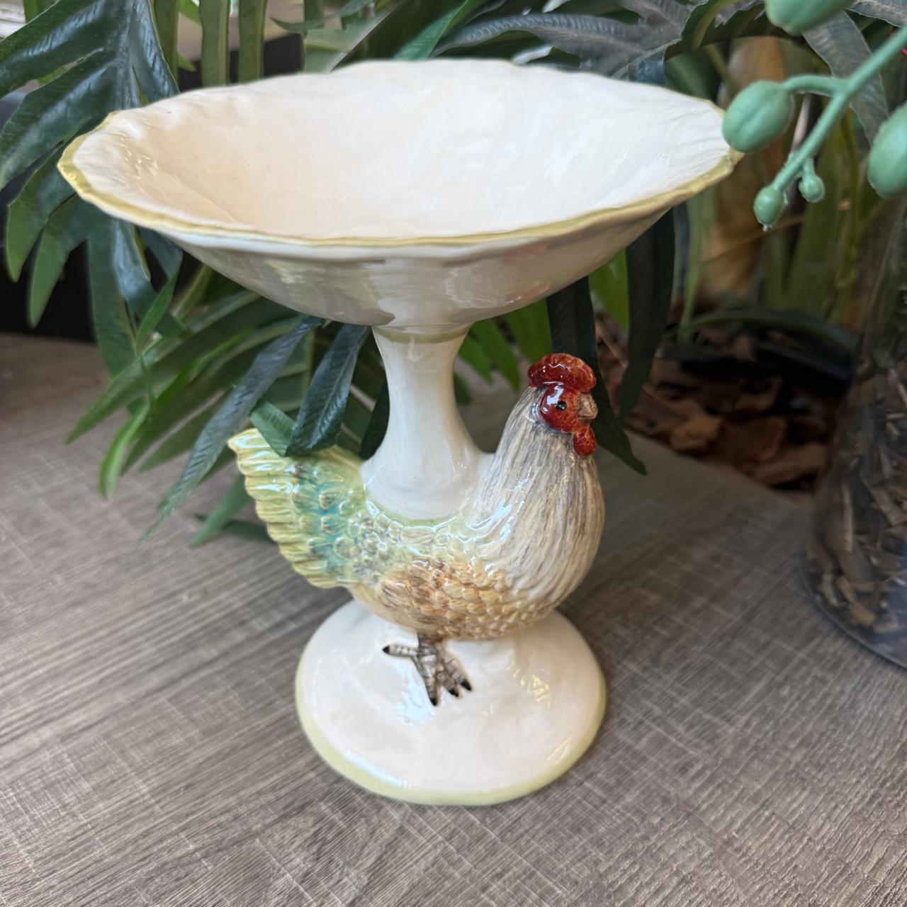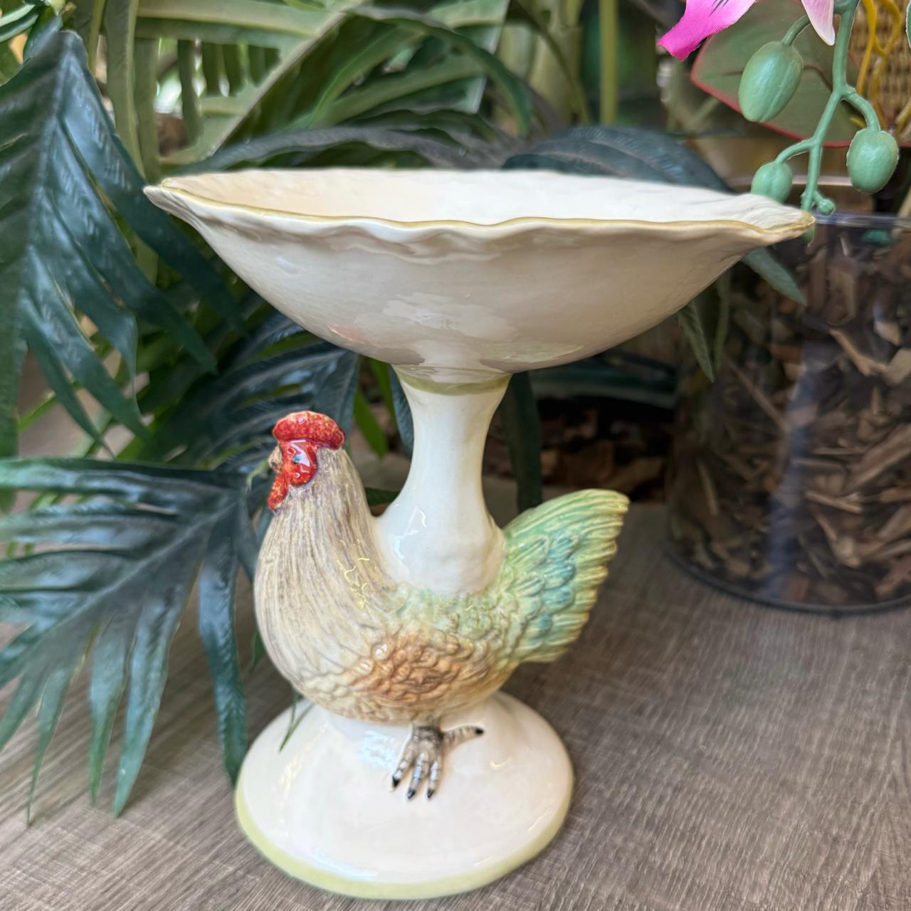 A petisqueira com base de galinha da Zanatta Casa é uma peça artística de cerâmica, feita e pintada à mão, conhecida por seu design charmoso e rústico-elegante.
