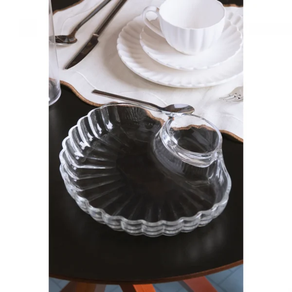 A Petisqueira Shell com Divisória para Molho 21,5cm x 19,5cm x 3,5cm de Vidro – Wolff é a peça ideal para servir petiscos com estilo e praticidade. Seu formato em concha, com uma divisão especial para molhos, facilita a disposição dos alimentos, tornando qualquer ocasião mais descontraída e organizada.