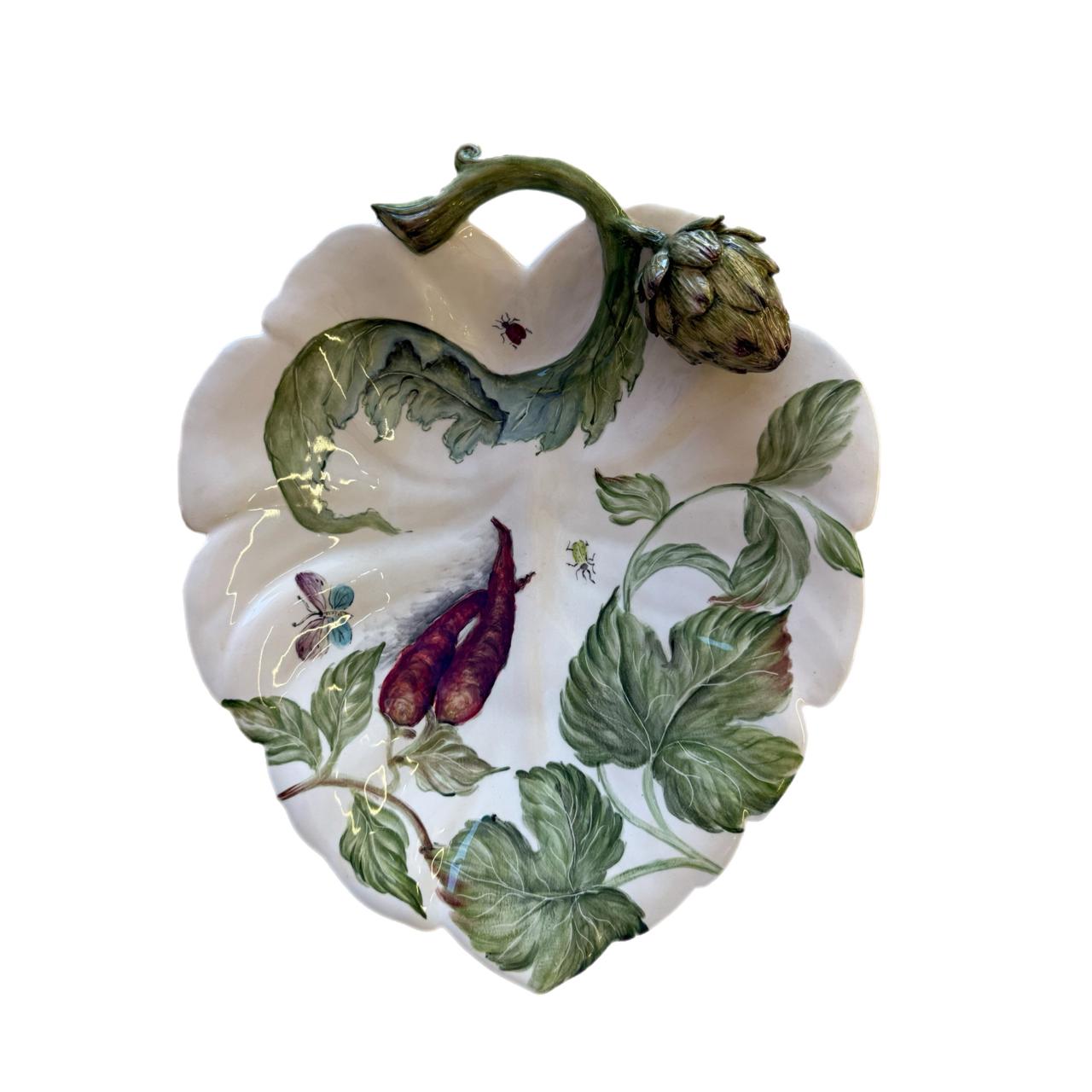 A travessa folha decorativa com aplicação de alcachofra vem em formato de folha, recebendo a aplicação de uma alcachofra, demonstrando elegância e sofisticação na hora de servir.